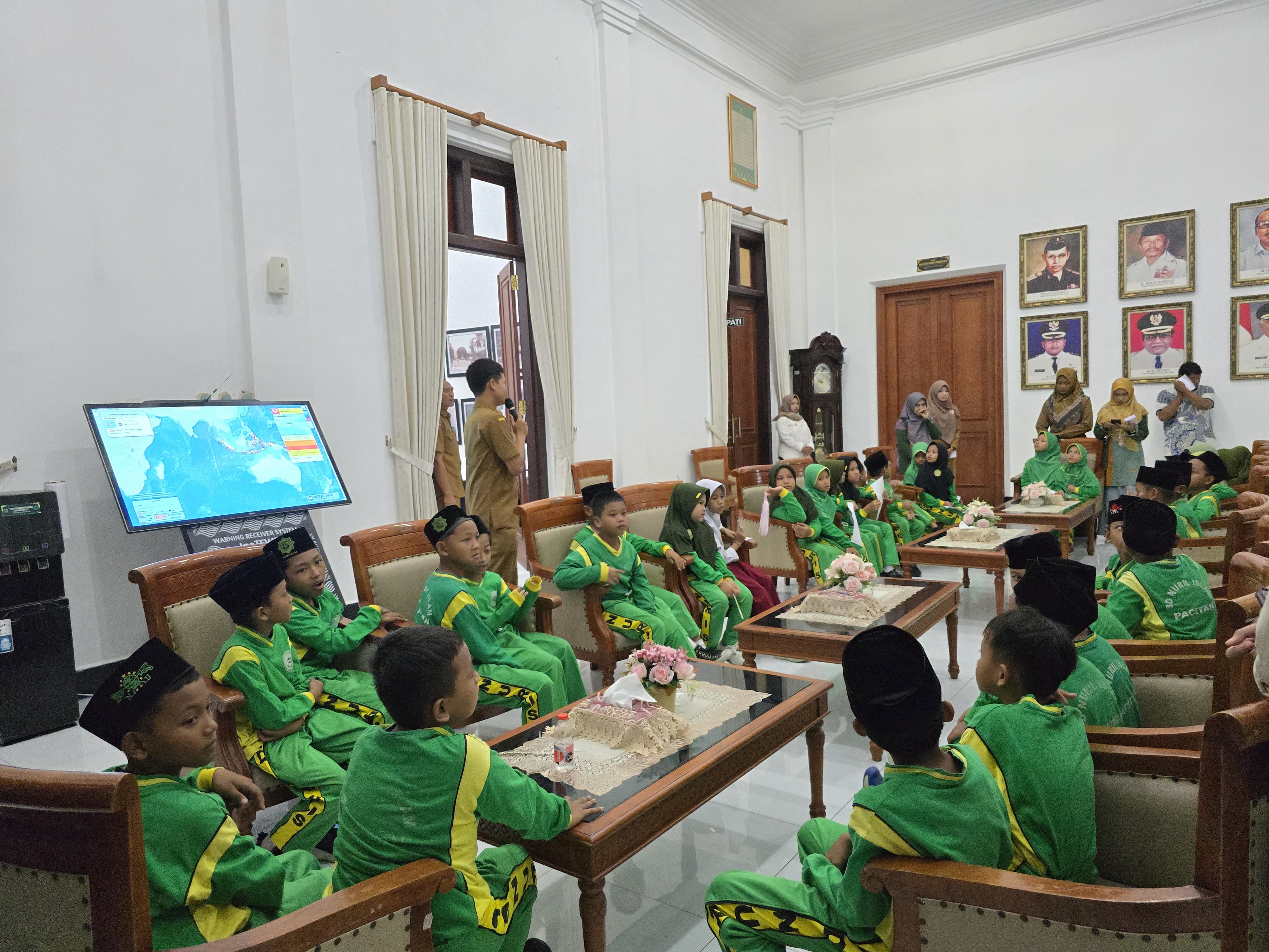 Pukul 08.00 siswa-siswi SD Nuril Islam berangkat menuju destinasi pertama yaitu Kantor sekaligus rumah dinas orang no.1 di Kabupaten Pacitan, Bp.Indrata Nur Bayuaji, S.S. yang terletak di pusat kota Pacitan. Disini, siswa-siswi disambut sangat baik oleh staff yg sudah siap mendampingi siswa-siswi berkeliling area Pendopo. Dengan dibagi menjadi beberapa kelompok, siswa-siswi diajak memasuki area dalam pendopo untuk dikenalkan dengan berbagai macam ruangan yg biasanya digunakan dalam kegiatan pemerintahan.